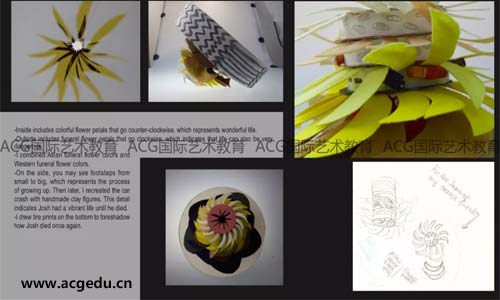 這件作品中間的彩色花瓣意味著精彩的人生,而順時(shí)針旋轉(zhuǎn)的花瓣是殯葬中才用的花瓣,代表生活中的不測(cè)和危機(jī)。兩種花色分別是東西方不同顏色的葬禮花色。從側(cè)面會(huì)發(fā)現(xiàn)逐漸變大的腳印,代表著成長(zhǎng)的過(guò)程。她還親自捏制粘土,重塑了車禍的場(chǎng)景,都是通過(guò)她自己思考,對(duì) Josh 一生的詮釋。