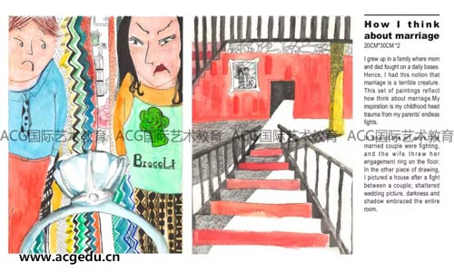 在她的作品中,一對(duì)已婚夫婦正在吵架,妻子把訂婚戒指直接扔在地上,而另一幅中描繪出了一對(duì)夫妻在房間中爭(zhēng)吵,還有破碎的婚紗照出現(xiàn),整個(gè)房間里籠罩著黑暗和陰影。