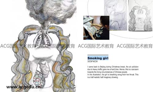 面對(duì)生活中的問(wèn)題,Wang 同學(xué)觀察入微,從簡(jiǎn)單的生活問(wèn)題到對(duì)自我的思考,都轉(zhuǎn)身變成她的創(chuàng)作題材。每年圣誕假期回北京的時(shí)候,她經(jīng)常被重度的空氣污染而困擾,這種生活環(huán)境造就了她的《Smoking girl》。