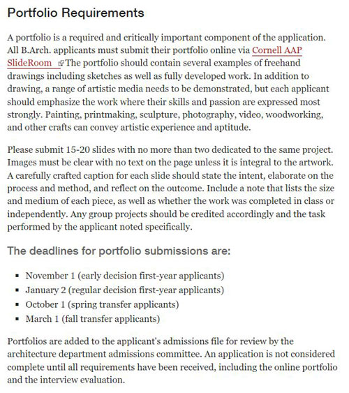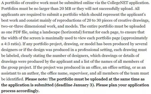 這個圖是康奈爾研究生的作品集要求,它一般都會規(guī)定作品集的大小,比方說不超過20M。它可能會規(guī)定頁數(shù)20到30頁之間,提交什么格式,橫版還是豎版。