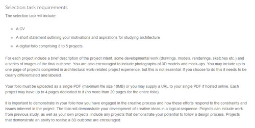 澳洲皇家墨爾本理工也是建筑非常好的,澳洲排名第一的學校。首先,也是有CV,statement 和3-5個project,這里沒規(guī)定頁數(shù)。有些同學可能會有疑問,有的學校要求寫20pages,有的寫20items,還有的像這個寫3-5個project,這是怎么回事?其實前兩個pages,items都是頁,每頁可以有多張圖片(但是不建議太多,不然網(wǎng)上預覽圖太小,影響觀感)。RMIT這個就相當于沒有頁數(shù)要求了,這3-5個項目就是包括所有的建筑類項目、繪畫、雕塑、裝置等等。
