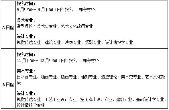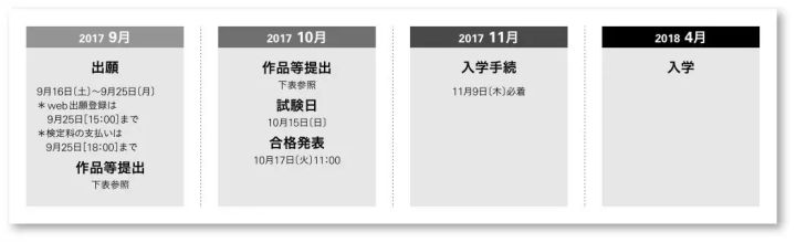 然后需要注意武藏野美術(shù)大學(xué)校內(nèi)考報(bào)名的時(shí)間,可以看出,映像學(xué)科的考試報(bào)名時(shí)間屬于A日程即9月中旬到下旬,每一年考試的具體日期會(huì)有輕微調(diào)整,因此,需要注意按時(shí)查詢學(xué)校官網(wǎng),以免錯(cuò)過報(bào)名日期。