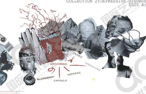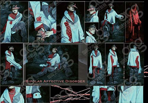 這個(gè)項(xiàng)目是想讓人們了解和接受現(xiàn)實(shí)生活中的痛苦,在面料和印花的選擇上面來(lái)表現(xiàn)主題,比如天鵝絨比鹿皮便宜一些,但是質(zhì)感差不多,是一種很高檔的感覺(jué),硬挺,體現(xiàn)出一種壓力,不放松的感覺(jué),大面積的用了這種材質(zhì)。還有紅色的緊實(shí)毛衣,是一種很緊實(shí)、束縛的感覺(jué),魚(yú)尾半裙,上面是紅血絲刺繡,整體就是想體現(xiàn)服飾的質(zhì)感,高檔的感覺(jué)。