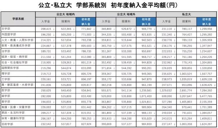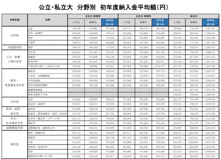 下面是日本公立、私立大學(xué)各學(xué)部初年度需繳納的平均學(xué)費(fèi)。