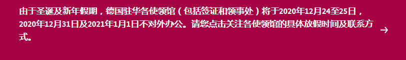 由于圣誕及新年假期,德國(guó)駐華各使領(lǐng)館(包括簽證和領(lǐng)事處)將于2020年12月24日至26日,2020年12月31日及2021年1月1日不對(duì)外辦公。