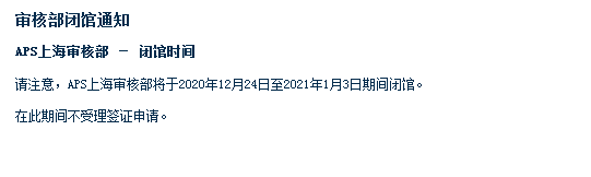 請(qǐng)注意,APS上海審核部將于2020年12月24日至2021年1月3日期間閉館。在此期間不受理簽證申請(qǐng)。