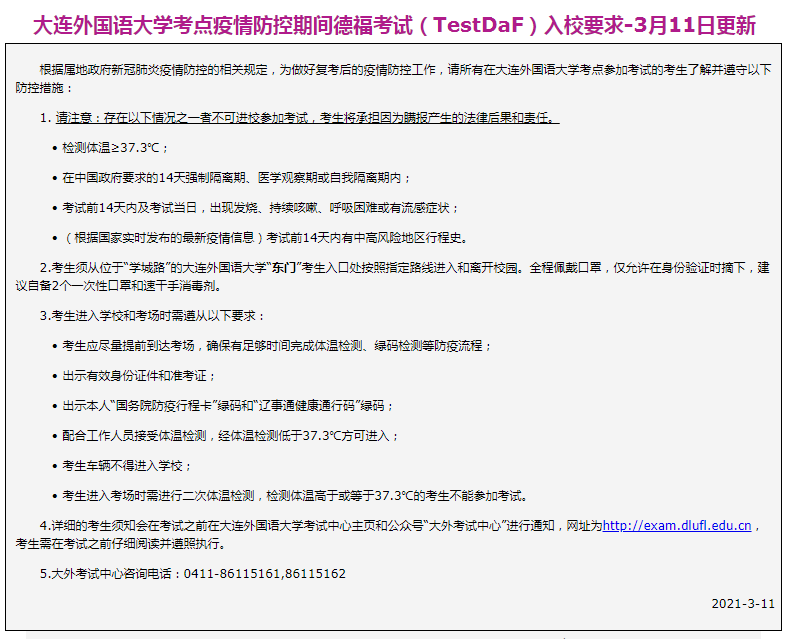 詳細的考生須知會在考試之前可在大連外國語大學考試中心主頁和公眾號“大外考試中心”進行通知。網(wǎng)址為http://exam.dlufl.edu.cn