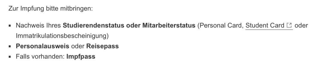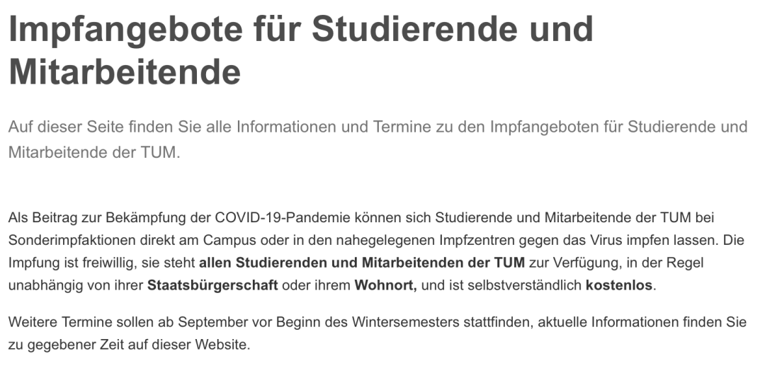 慕尼黑工業(yè)大學(xué)將在校區(qū)內(nèi)為學(xué)生開展免費(fèi)的疫苗接種?!?..k?nnen sich Studierende und Mitarbeitende der TUM bei Sonderimpfaktionen direkt am Campus oder in den nahegelegenen Impfzentren gegen das Virus impfen lassen. “(TUM 的學(xué)生和教職工可以在校園內(nèi)或附近的疫苗接種中心直接進(jìn)行疫苗接種。)