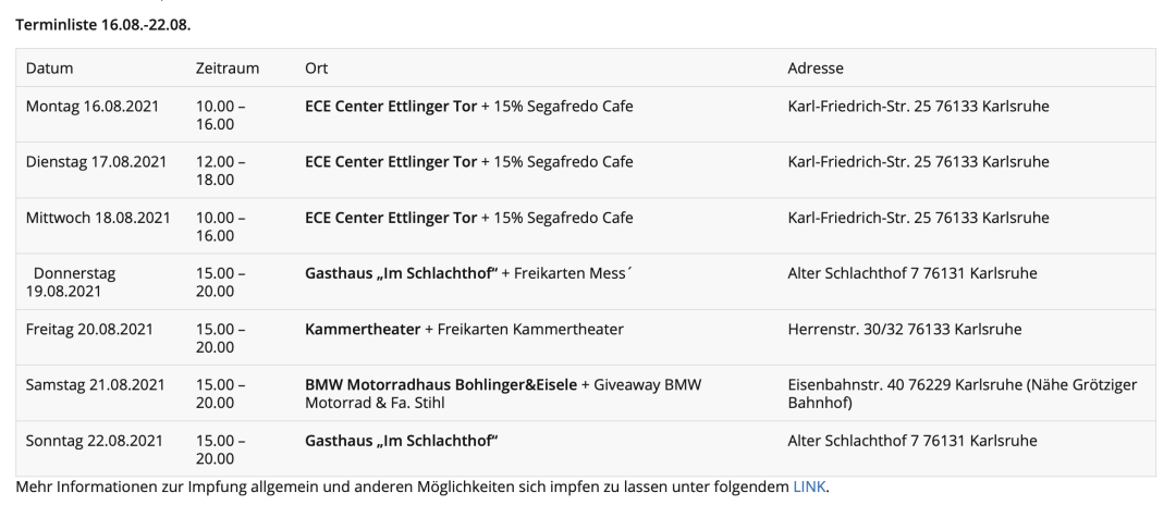 亞琛官網(wǎng)上可以找到預(yù)約接種疫苗的鏈接,最近可以預(yù)約接種疫苗的時(shí)間是8月17、18日,19日已經(jīng)被預(yù)約滿。