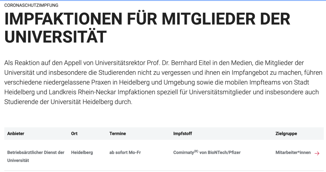 海德堡大學(xué)的學(xué)生也可以在校內(nèi)接種疫苗了!學(xué)生或教職員工只需要在巴登符騰堡州的網(wǎng)站 www.impfen-bw.de 上進(jìn)行預(yù)約注冊,就可以在學(xué)校內(nèi)的醫(yī)療機(jī)構(gòu)接種疫苗了。