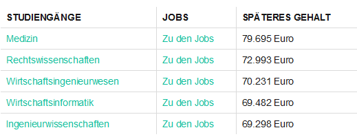 醫(yī)生在德國掙得多早就不是秘密了。醫(yī)生是所有德國職業(yè)里掙得最多的。然而他們和法學(xué)學(xué)生一樣,學(xué)習(xí)也是最辛苦的,需要上大學(xué)的時(shí)間最久。到德國第一次針對醫(yī)生和律師的國家考試為止,這兩個(gè)專業(yè)的學(xué)生都要完成8至10學(xué)期的學(xué)期,然后是兩年的實(shí)習(xí)期。本科一般至少需要3年,碩士需要兩年。下面的專業(yè)列出了6學(xué)期本科畢業(yè)以后工資最高的專業(yè)。