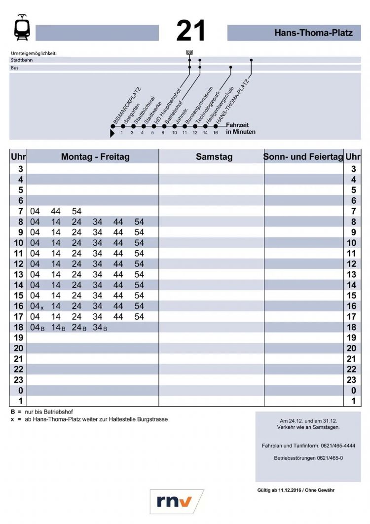 海德堡21路有軌電車的列車時刻表(Fahrplan)