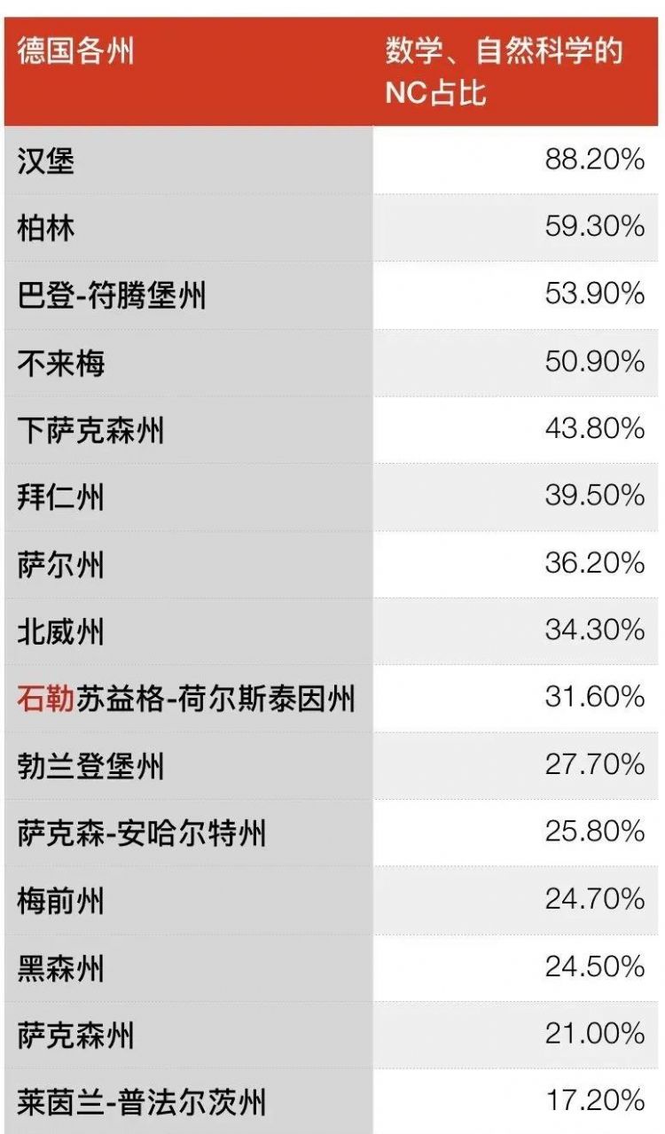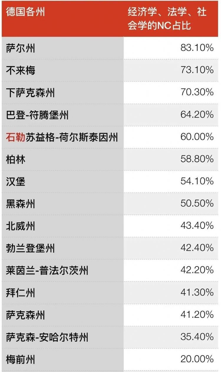 而像石荷州、拜仁州、薩克森-安哈爾特州、萊茵蘭-普法爾茨州、梅前州、黑森州的NC占比均低于20%;