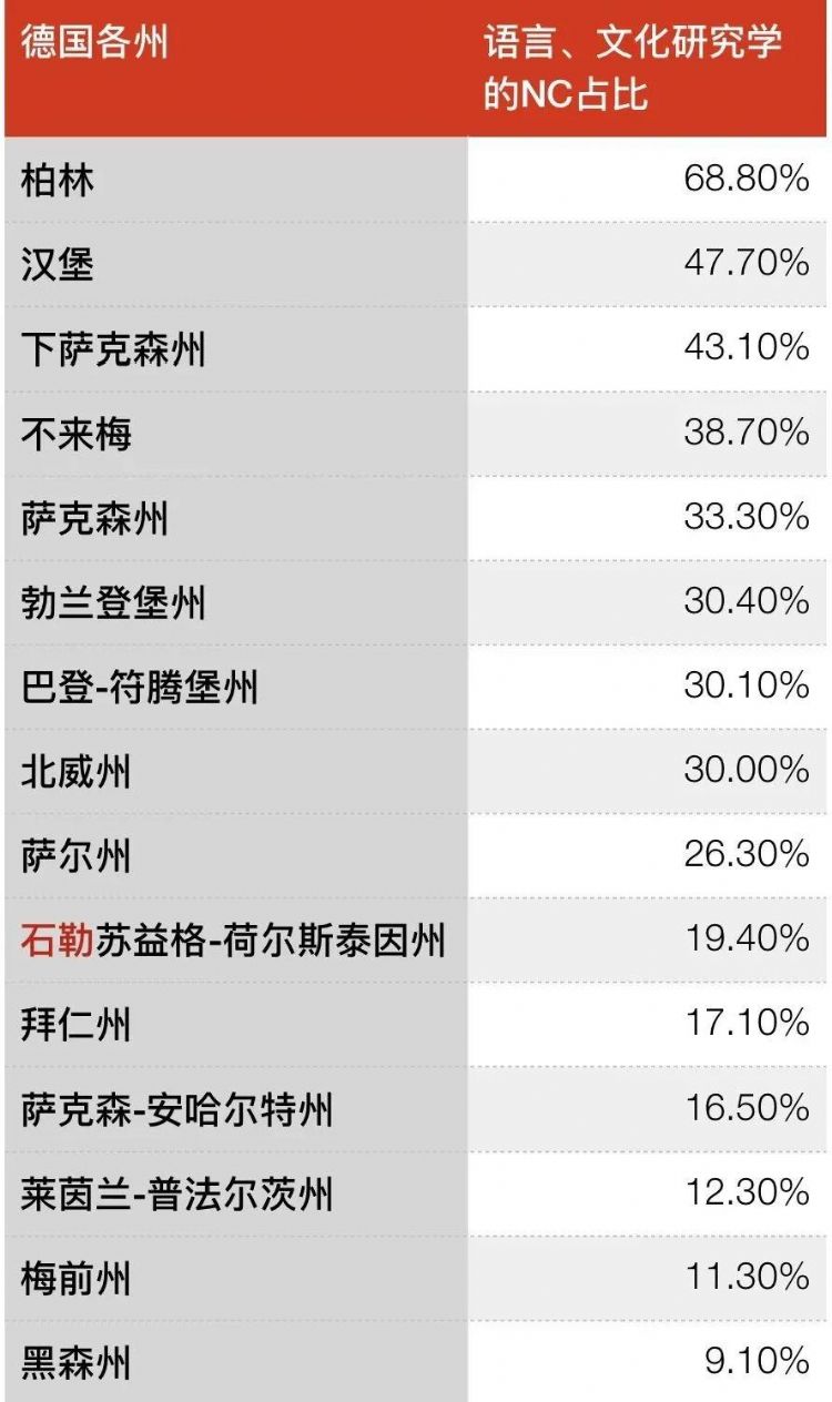如上圖所示,在語(yǔ)言、文化研究學(xué)領(lǐng)域,柏林地區(qū)的NC占比最高,達(dá)到68.8%,其次就是漢堡、下薩克森地區(qū)的NC占比也高于40%;