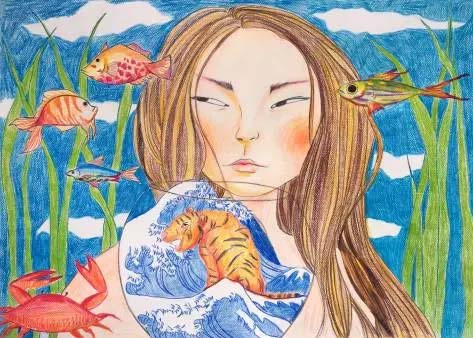 老虎是我的中國(guó)生肖。老虎被限制在一個(gè)魚缸里面,里面有洶涌的海浪。很多人過去也面臨著類似的情況:無法擺脫浪潮,找不到出路。在這張自畫像上,盯著魚缸和老虎的女孩都是我的代表,有時(shí)候,我發(fā)現(xiàn)自己像那個(gè)女孩一樣掌握了所有的東西,有時(shí)候我又像那只老虎一樣受到限制。